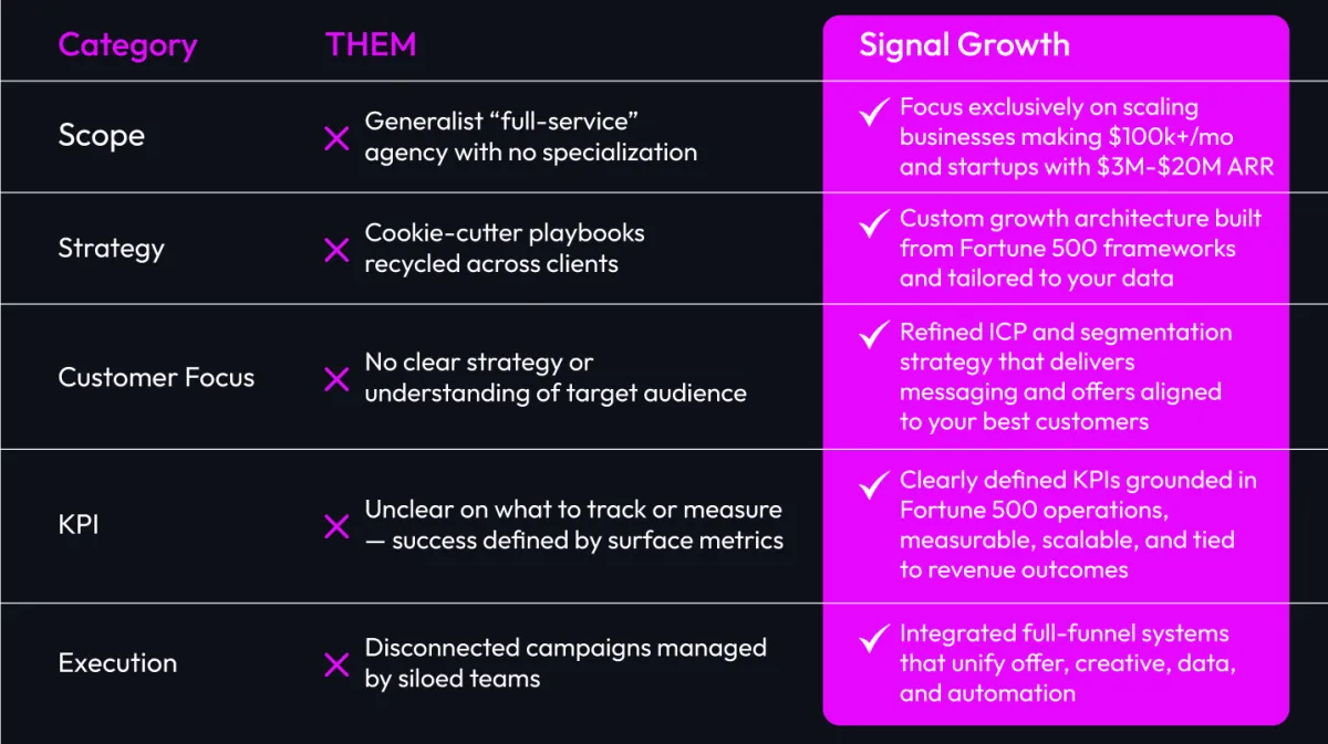 Continue with us on a retainer ($5-$15k/month) — ideal if you want Signal Growth to keep optimizing and compounding your results.