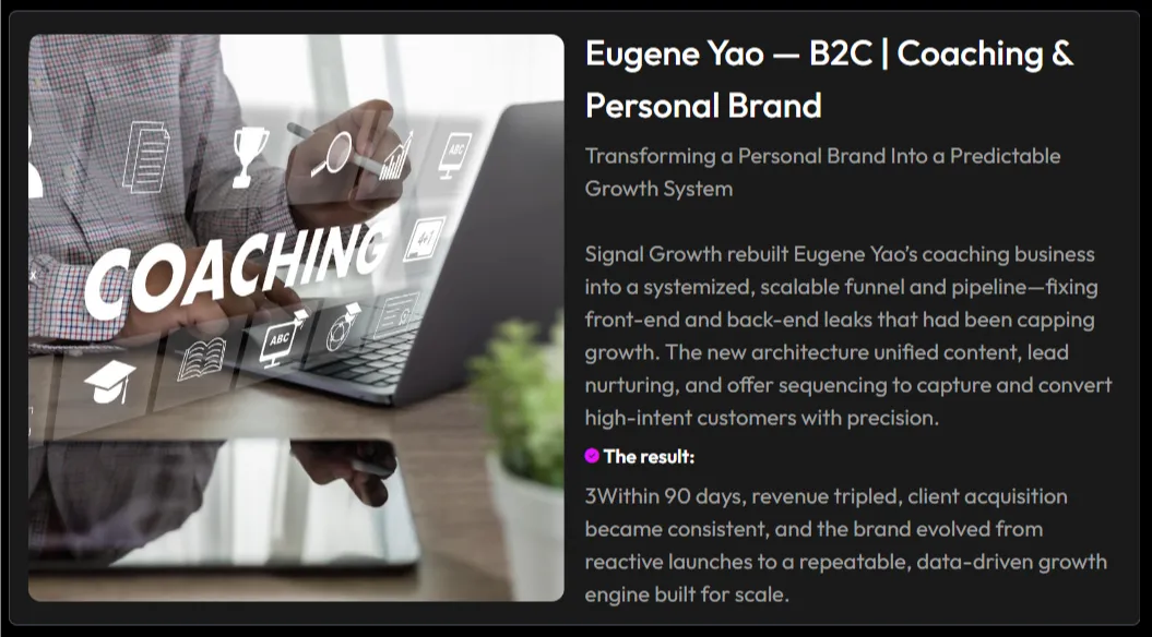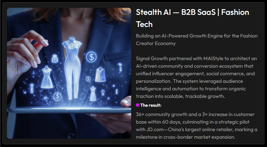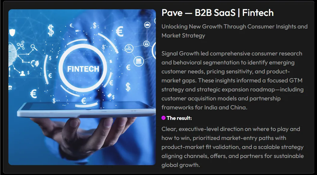 Our playbooks span AI SaaS, FinTech, CPG, Consumer Tech, Real Estate, and AlcBev, delivering proven results for both Fortune 500 companies and hyper-growth startups. We partner with founders typically between $3M–$20M ARR, and also provide growth audits for emerging startups that need clarity on why their growth has stalled.